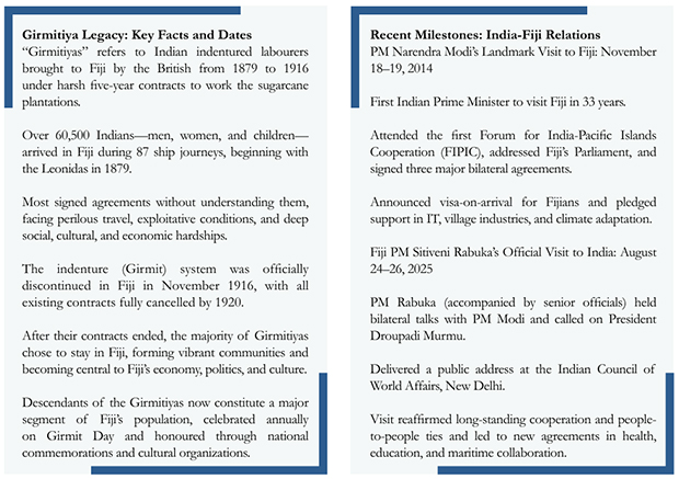 For many years, the Indian diaspora, particularly those who left during the indenture period, were not formally recognised in India. In the past two decades, this has changed. I thank Prime Minister Modi for acknowledging girmitiya history. I have also called for an International Day on Girmit so that the sacrifices of over a million indentured labourers are honoured globally. This recognition will further strengthen India–Fiji relations and inspire future generations.