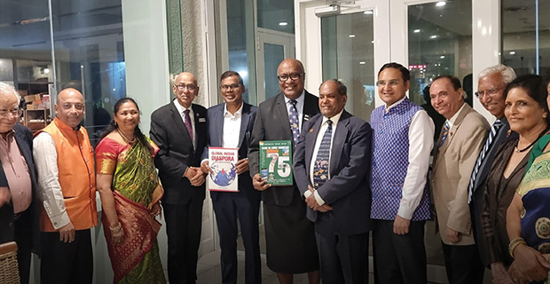 Two books produced by India Empire (one on GOPIO authored by Sayantan Chakravarty and another one on the Indian Community in Los Angeles) presented to Fijian Deputy Prime Minister Hon. Biman Prasad (4th from left) and Fijian Deputy PM Hon. Manoa Kamikamica (5th from left) by the GOPIO International team in Fiji in March 2025. Also in the picture is Indian High Commissioner H.E. Suneet Mehta (7th from left). The GOPIO International team was led by its Chairman Dr Thomas Abraham (6th from left) and included President Mr Prakash Shah (8th from left), Executive Vice President Mr Umesh Chandra (3rd from left), Vice President Mr Kewal Kanda (9th from left), General Secretary Mr Siddharth Jain (1st from left) and Ms Vasu Pawar (extreme right).