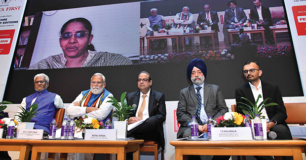 Plenary II panelists listen to Ms Saalai Manikam (on large screen), Promoter and MD, Arima Group, Accra, Ghana, give her presentation virtually from Ghana. Seated on dais are (from left) Dr. Manoharan Krishna, Chief Advisor, Hazaa Naturaa Organica Africa; Dr C.K. Ashok Kumar, Founder, First World Community; Mr Neeraj Bansal, Partner and Head Global, KPMG in India (moderator); Mr T S Ahluwalia, Managing Committee Member, FIEO, and Director, TMA International Pvt Ltd; Mr Shamik Joshi, Head-Presales & Gateway, Amnex Infotechnologies Pvt Ltd