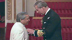 | Dr Rami Ranger, FRSA, receiving the MBE (Member of British Empire) for services to British business and the British Asian community from the Prince of Wales. |