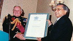 Dr Ranger, chairman of Sea Air and Land Forwarding receiving the Queens Award for export achievement 1999 from the Queen’s Special Representative Field Marshall John Chapple |